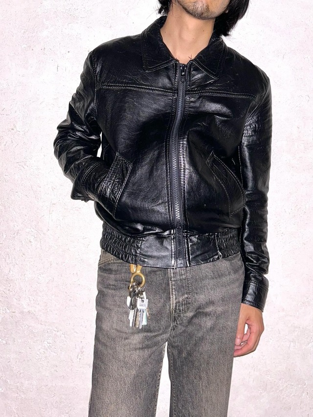 UKスタイルのリブレザージャケットです。 革質は柔らかく、USタイプの無骨さや角張った印象と違い、スマートで音の匂いのするシルエット。 HERO'Sのジャケットのデヴィッド・ボウイや、クラッシュのジョー・ストラマーが着ていたあのイメージ。 お気に入りのTシャツがよく映える革ジャンです。 素材 レザー サイズ表記 なし 実寸サイズ 肩幅 47.5cm 身幅 58cm 袖丈 63cm 着丈 60cm ※掲載商品は全て海外で買い付けたUSEDの物になります。 文章では伝えきれない古着特有の使用感や経年変化等もございます。 こちらも含めて楽しんで頂けたらと思います。 商品のダメージ部分やコンディションはできるだけ写真にてお伝えしますが、気になる方はトップページのcontactまたはInstagramのDMよりお問い合わせくださいませ。